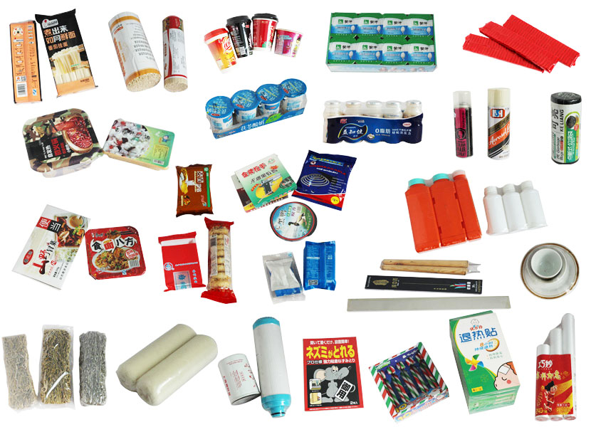 雪糕、方便面、月餅、餅干、面包、肉制食品、冷凍食品、香皂、藥板、塑瓶輸液、蚊香、塑料刀叉、卡片、碗面、掛面、一次性餐具、奶茶、墻紙、果奶、盒、瓶等熱收縮外包裝等